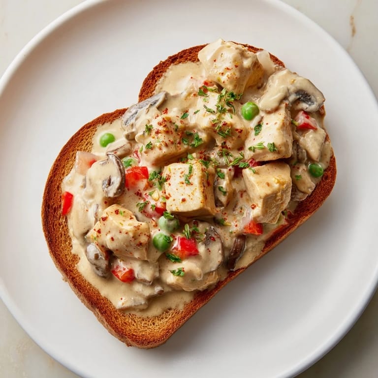 Save A classic, creamy chicken dish with mushrooms, peppers, and peas, served warm over crisp buttered toast. Comforting and full of flavor, perfect for a quick weeknight dinner or casual brunch.