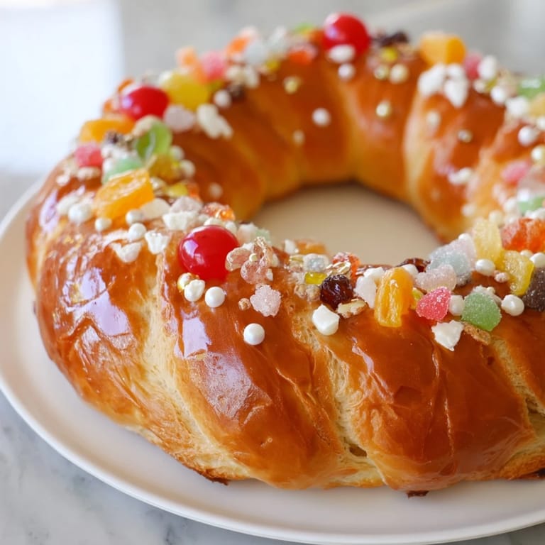 Save A festive and dazzling sweet bread shaped like a crown, adorned with colorful candied fruits and sugar pearls—a showstopping centerpiece perfect for celebrations.