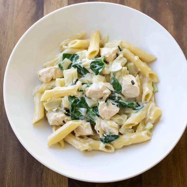 Save A hearty, protein-packed skillet pasta featuring a creamy sauce, tender spinach, tangy artichokes, and your choice of protein for a satisfying one-pan meal.