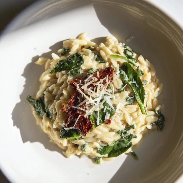 Save A rich and comforting bowl of orzo pasta simmered in a creamy garlic-Parmesan sauce with sun-dried tomatoes, spinach, and a hint of Italian herbs. Perfect for a satisfying vegetarian meal.