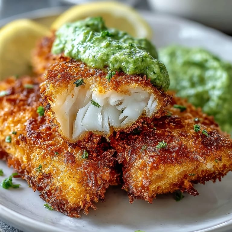 Save I was standing in the freezer aisle, staring at a bag of frozen peas, when the idea struck me. My partner had just mentioned missing proper fish and chips, but I wanted something lighter, more elegant. The Parmesan in my fridge and a bunch of basil on the counter somehow connected in my mind, and by that evening, these goujons were born. They turned out so much better than I expected, crispy and golden with that vibrant green pesto cutting through the richness. Now they show up at least twice a month in our house.
