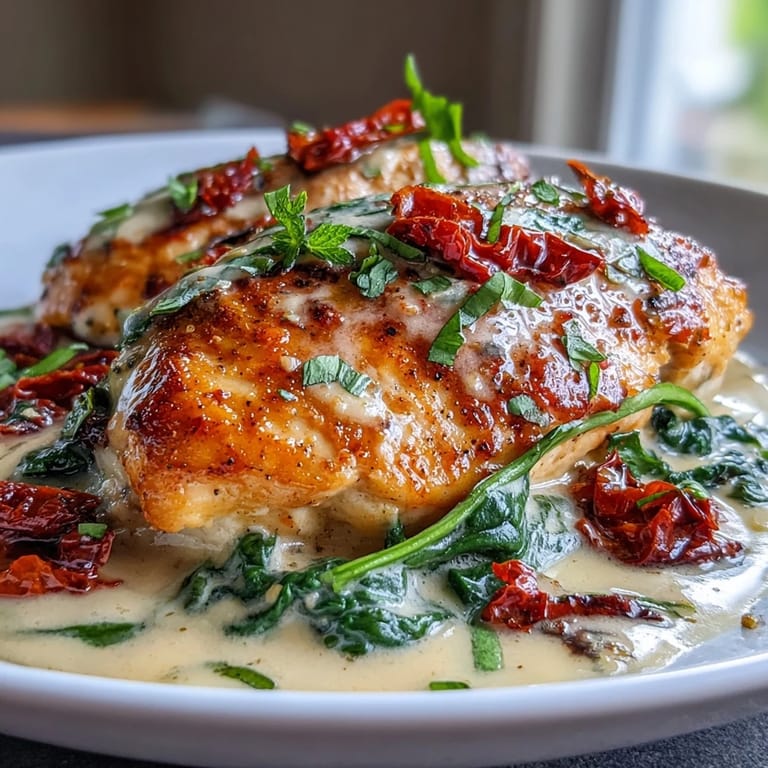 - Sauce: 2 tbsp olive oil, 2 tbsp unsalted butter, 3 cloves garlic (minced), 100 g sun-dried tomatoes (drained and sliced), 200 ml heavy cream, 60 ml chicken broth, 60 g freshly grated Parmesan cheese, 80 g baby spinach, 1/2 tsp dried Italian herbs, pinch of crushed red pepper flakes (optional)