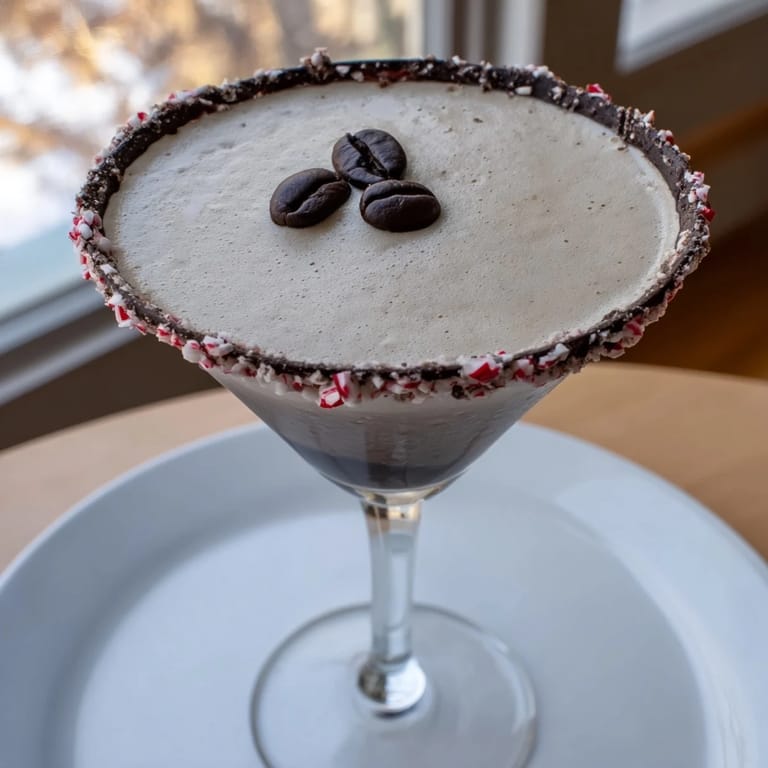 Save A festive, creamy cocktail blending espresso, vodka, and peppermint, finished with a chocolate peppermint rim perfect for holiday celebrations.