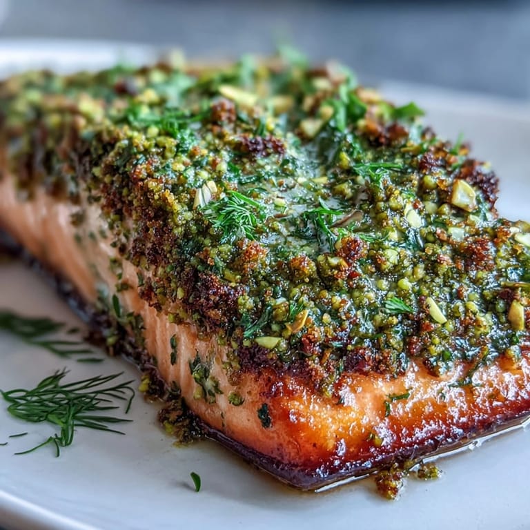Save Elevate your weeknight dinner with this elegant Pistachio-Crusted Salmon. This dish features tender salmon filets encased in a vibrant, crunchy layer of finely chopped pistachios, fresh parsley, and dill. Pan-searing the filets creates a beautiful golden crust that contrasts perfectly with the flaky, buttery texture of the fish, delivering a gourmet experience in just 30 minutes.