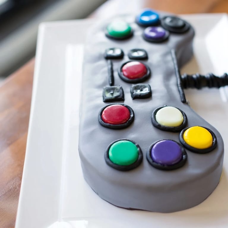 Save A playful, colorful cake designed to look like a classic video game controller, perfect for parties and gaming fans.