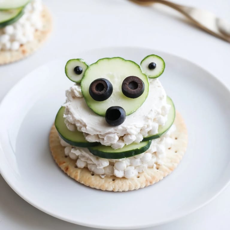 - Using a small spoon or piping bag, drop a rounded mound of cream cheese mixture onto the cucumber slice as the polar bears head.