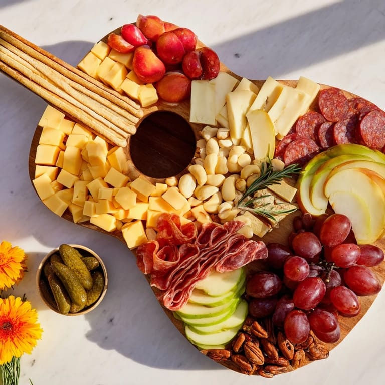 Save A bold, show-stopping party platter inspired by rock concerts, featuring a medley of crowd-pleasing snacks, cheeses, cured meats, and crunchy bites arranged in the shape of a guitar for maximum visual impact.