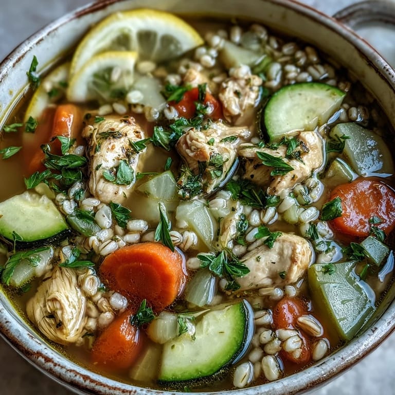 - Add the diced zucchini, cover, and simmer for another 10–15 minutes, or until barley is tender and chicken is fully cooked.