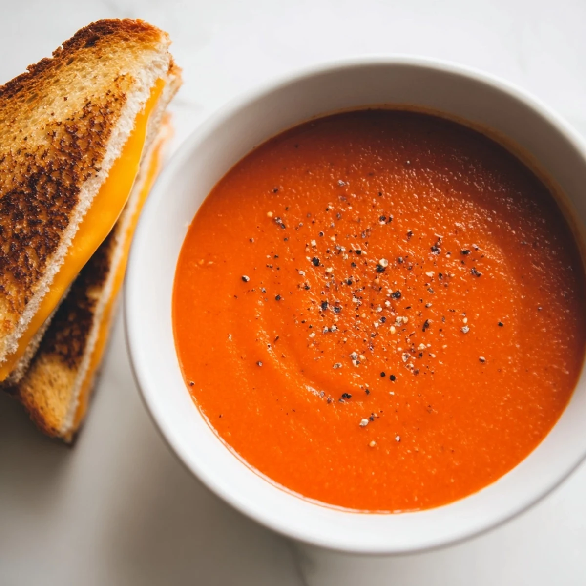 Save A comforting, classic combo featuring creamy tomato soup and crispy, melty grilled cheese perfect for dipping.