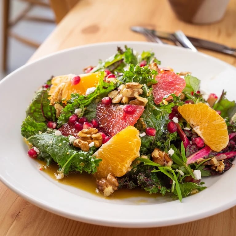Save A vibrant, refreshing salad featuring hearty winter greens, juicy citrus, ruby pomegranate seeds, and crunchy toasted nuts, perfect for brightening cooler days.